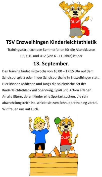 Die Kinder der Leichtathletikabteilung des TSV Enzweihingen haben in den Altersklassen U8, U10 und U12 mit insgesamt 11 Sportler/-innen erfolgreich am Kinderleichtathletiksportfest in Bietigheim teilgenommen. Aufgeteilt war der Wettbewerb in eine Laufveranstaltung, einen Mehrkampf sowie eine anschließende Biathlonstaffel. Beim…