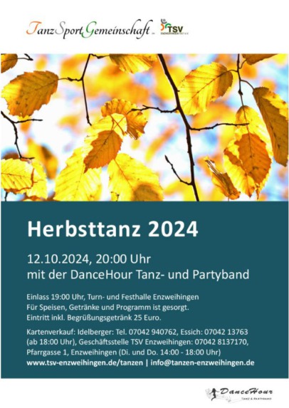 12.10.2024, 20:00 Uhr mit der DanceHour Tanz- und Partyband. Einlass 19:00 Uhr, Turn- und Festhalle Enzweihingen. Für Speisen, Getränke und Programm ist gesorgt. Eintritt inkl. Begrüßungsgetränk 25 Euro.