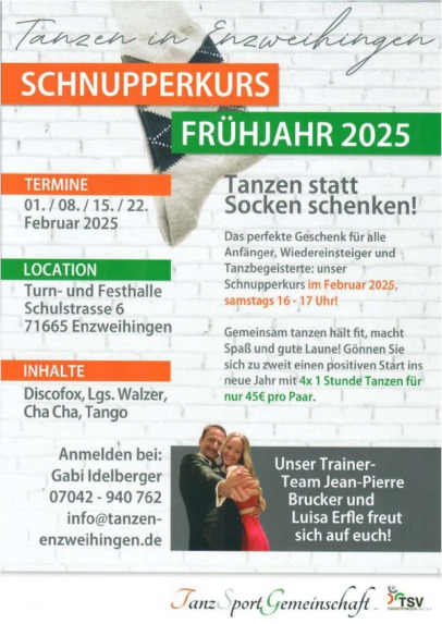 Entdecken Sie den Schnupperkurs in Enzweihingen! Perfekt für Anfänger und Paare: 4×1 Stunde Tanzen im Februar 2025. Spaß, Bewegung und Tanzfreude garantiert!