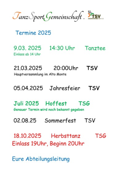 Tanzen, feiern und Gemeinschaft erleben! Entdecken Sie die Highlights der TanzSportGemeinschaft 2025 – von Tanztee bis Herbsttanz. Jetzt Termine vormerken!