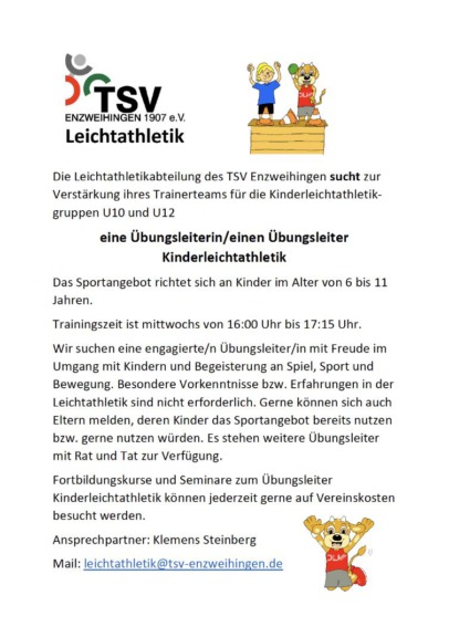 Unterstützung gesucht! Engagierte/r Übungsleiter/in für Kinderleichtathletik U10/U12 beim TSV Enzweihingen. Sportliche Kinder von 6-11 Jahren, mittwochs 16-17:15 Uhr. Keine Erfahrung nötig, nur Freude an Bewegung. Eltern herzlich willkommen. Kontakt: leichtathletik@tsv-enzweihingen.de.