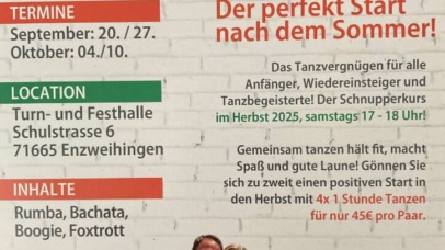 2002 vereinigten sich diese Tänzer wieder zur TanzSportGemeinschaft im TSV Enzweihingen1907 e.V. Die Mitgliederzahl stieg bald über 100; das Tanzprogramm wurde bis heute mit Tango Argentino, Salsa, Linedance und Discofox ausgeweitet. Deshalb engagierten wir 2002 Anja Aldinger als weitere Trainerin.